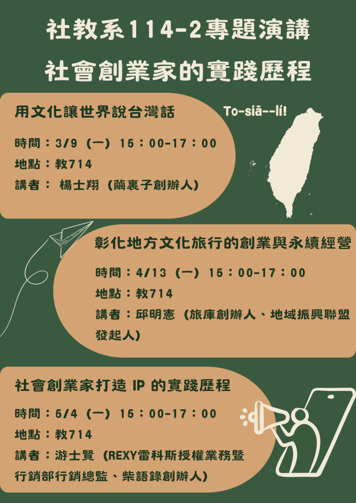 114下學期 專題演講主題:社會創業家的實踐歷程 3/9(一)15:00 – 17:00 講者:楊士翔(繭裏子創辦人) 講題:用文化讓世界說台灣話 4/13(一)15:00 – 17:00 講者:邱明憲(旅庫創辦人、地域振興聯盟發起人) 講題:彰化地方文化旅行的創業與永續經營 5/4(一)15:00 – 17:00 講者:游士賢(REXY雷科斯授權業務暨行銷部行銷總監、柴語錄創辦人) 講題:社會創業家打造 IP 的實踐歷程 Post author:ace Post published:2026-01-13 114下學期 專題演講主題:社會創業家的實踐歷程