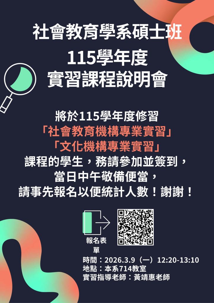 將於115學年度修習「社會教育機構專業實習」或「文化機構專業實習」課程的學生,此附上甫修訂通過之「國立臺灣師範大學社會教育學系校外實習要點」供參,並請擬參與實習同學進入google表單訂餐,因法規和流程皆有更動,務請同學撥冗參加,謝謝。