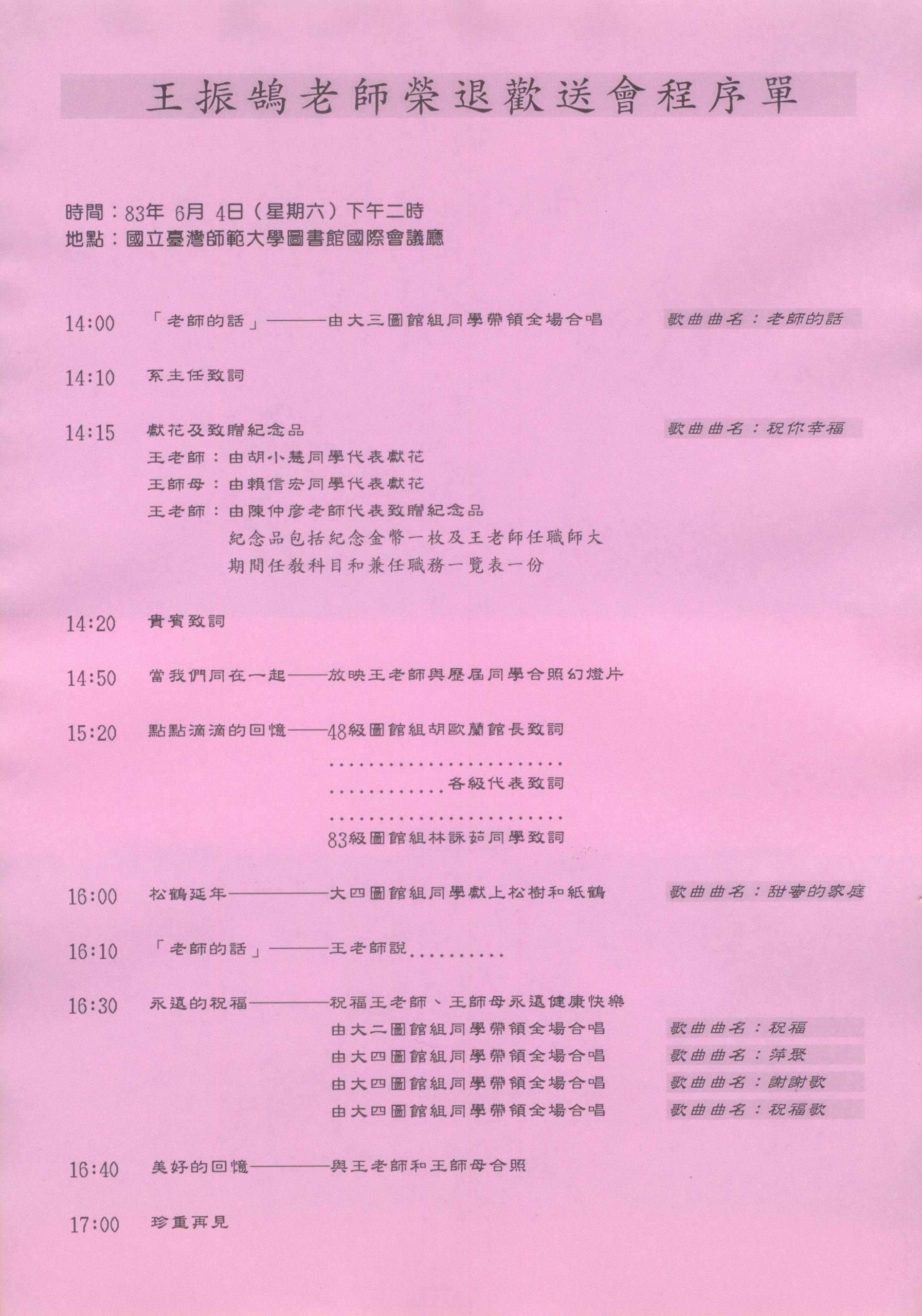三十年前舉辦王振鵠老師榮退歡送茶會,曾拍攝錄影帶、相片等以為紀念。由於年代久遠,幾經轉檔後的影片、相片等,雖然影質不甚理想,不過從中可以看到、聽到早期師長們的身影,甚至是系友自己年輕時的容貌,均為珍貴的影像紀錄。於是乃稍加整理,特提供系友們回味懷念。惟因屬私密性質,故請勿公開外流。謹此致謝。